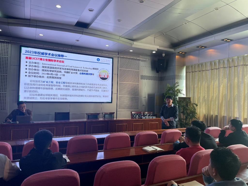 会上,赵同彬副院长对色情直播 研究生近年来参加学术交流情况进行了总结,从六个方面强调了研究生广泛参与学术活动的重要意义。赵院长指出,在读研究生参与学术交流活动有助于了解学术前沿、开拓学术思路、拓展学术资源、提高学术影响、积累学术经验、积攒学术成果,并鼓励在读研究生“走出去、讲出来”。色情直播 研究生管理办公室张鹏飞老师向全体参会人员推荐了“首届IJCST博士生国际学术论坛”、“第42届国际采矿岩层控制会议”、“第19届学生与青年学者国际论坛”等2023年矿业学科领域及相关学术组织计划举办的重要学术会议,并介绍了会议的具体情况,给出了博士研究生参会的指导意见。