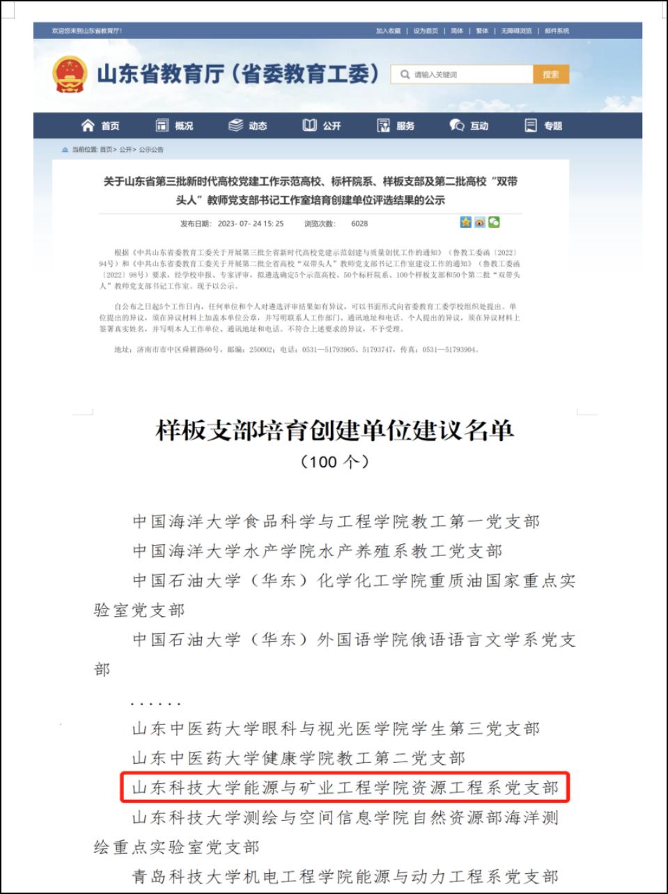 近日,中共山东省委教育工委发布《关于公布山东省第三批新时代高校党建工作示范高校、标杆院系、样板支部及第二批高校“双带头人”教师党支部书记工作室培育创建单位名单的通知》,色情直播 资源工程系党支部获评“样板支部”培育创建单位。