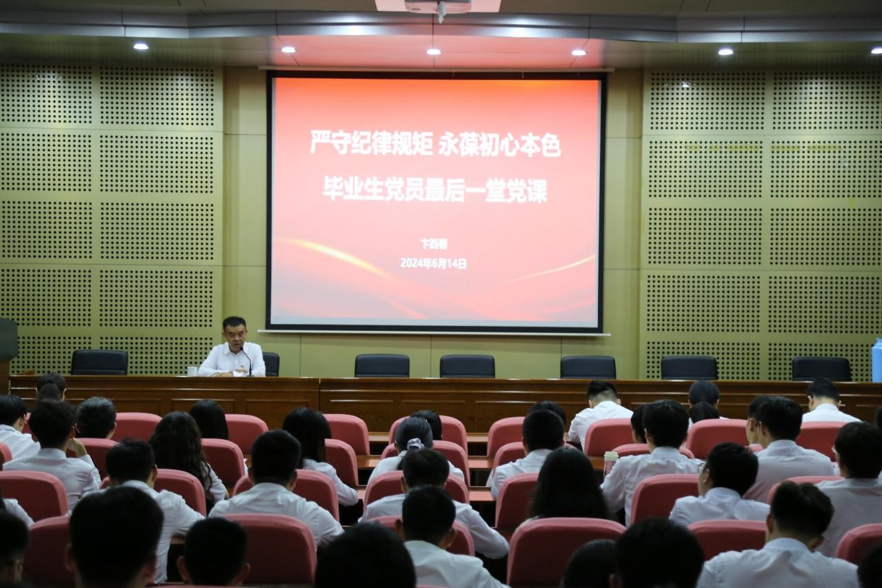 卞西春以“严守纪律规矩 永葆初心本色”为题为毕业生党员呈现了一场富有启发性和指导性的纪律党课。他指出,入党宣誓是一名党员政治生命的开始,也是一次深刻的党性教育,每一位共产党员应时刻牢记入党誓词,真正做共产主义远大理想和中国特色社会主义共同理想的坚定信仰者和忠实实践者。卞西春希望全体党员要通过此次党课的学习,一要把准方向,将“敬畏”牢记心间,始终对党的理想和宗旨保持崇高的敬意;二要深学细悟,把“条例”作为标尺,严格遵守,以确保行为和决策都符合党的原则和规定;三要细照笃行,用“自律”时刻警醒,不断提高自身的党性修养和道德品;四要实干担当,将“干事”落于行动,扎实践行党员的责任意识,努力成为一名有自信、肯奉献、勇担当的中国共产党党员。