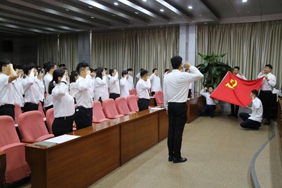 宣誓仪式在雄壮的《国际歌》中拉开帷幕。在毕业生党员马凌骥的领誓下,全体党员面向党旗,庄严宣誓。一段誓词,一份担当。在激昂的宣誓声中,每名党员用心传递着昂然向上的斗志和为共产主义事业奋斗终身的决心。