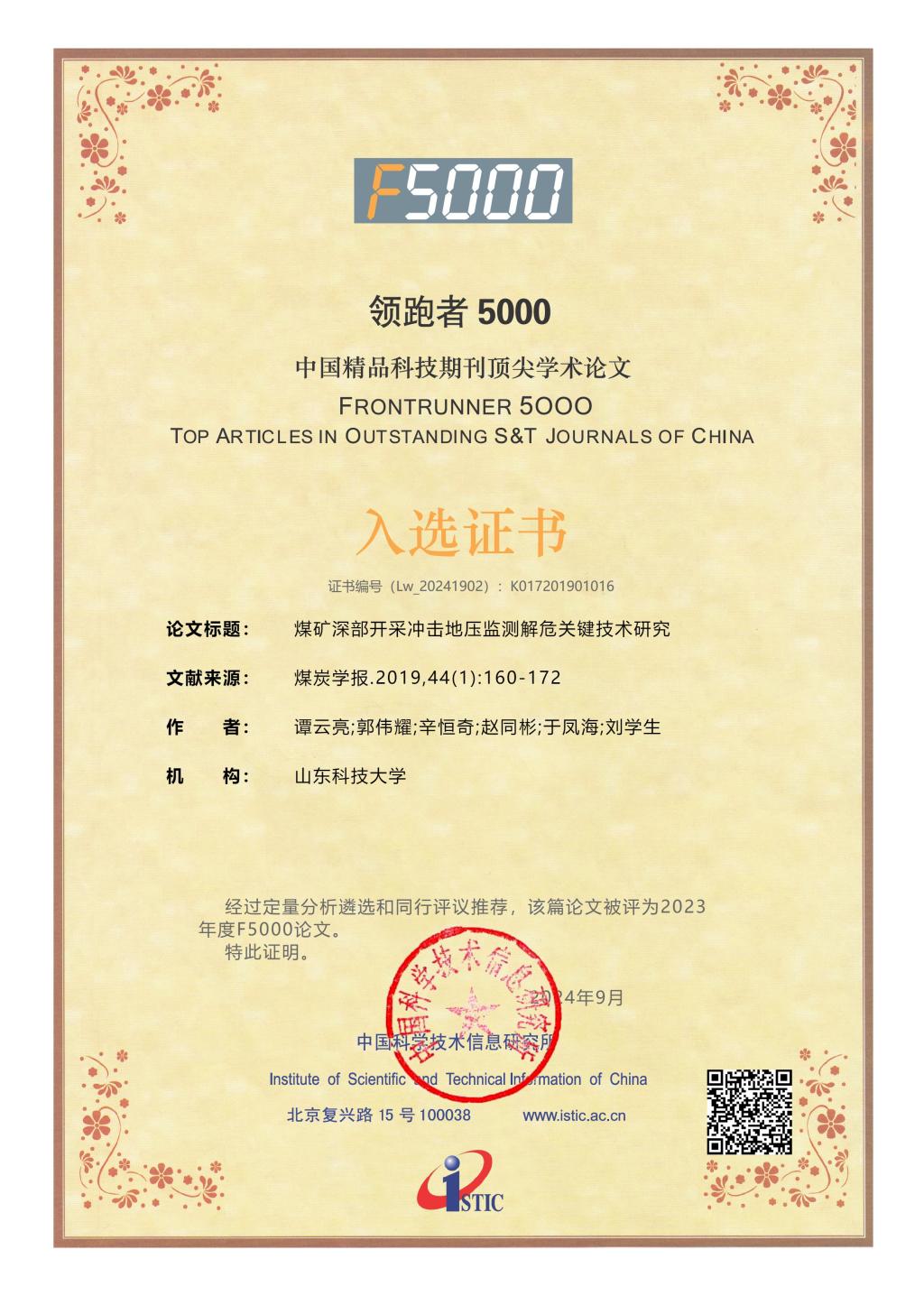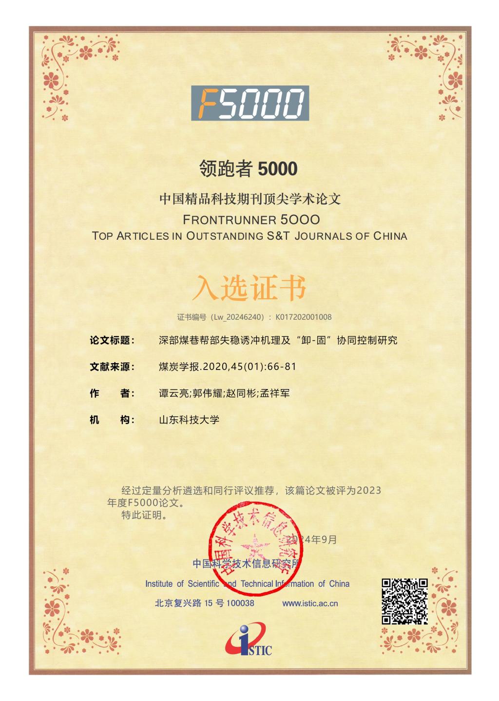 近日,科技部中国科学技术信息研究所发布了2023年度“领跑者5000—中国精品科技期刊顶尖学术论文(F5000)”入选论文名单。色情直播 谭云亮教授等在《煤炭学报》发表的“煤矿深部开采冲击地压监测解危关键技术研究”“深部煤巷帮部失稳诱冲机理及‘卸-固’协同控制研究”两篇论文,入选2023年度(2024年公布)F5000论文。